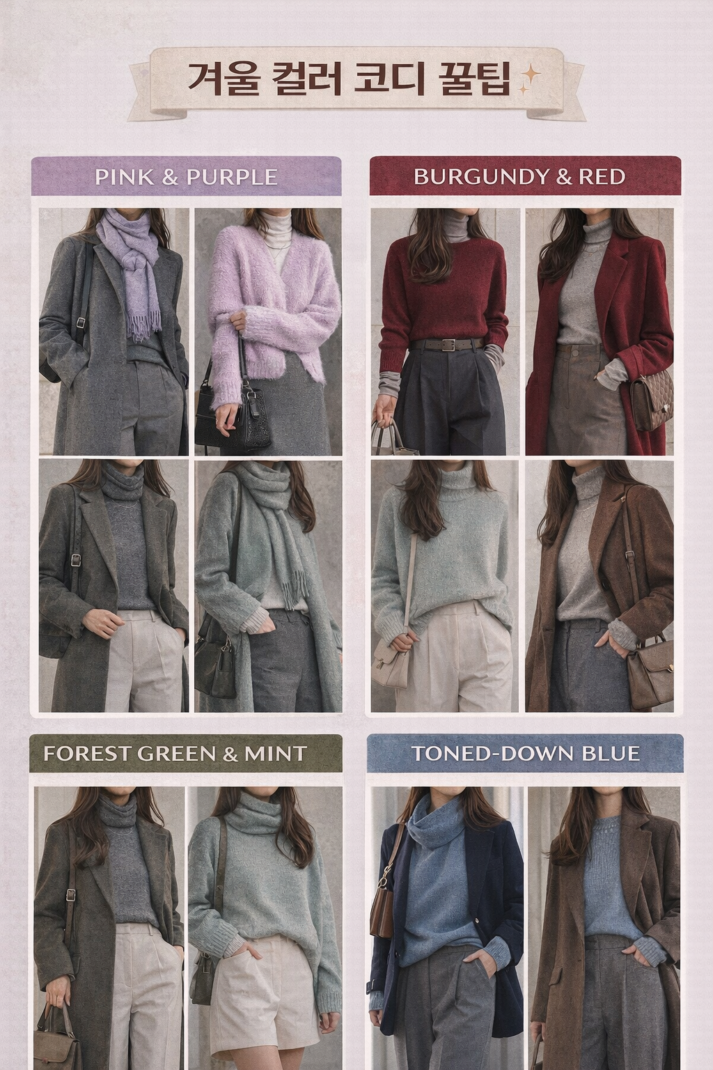 | 무채색 70% 비율 | 차콜 코트, 그레이 폴라 등 | 시각적 쿠션 역할 |