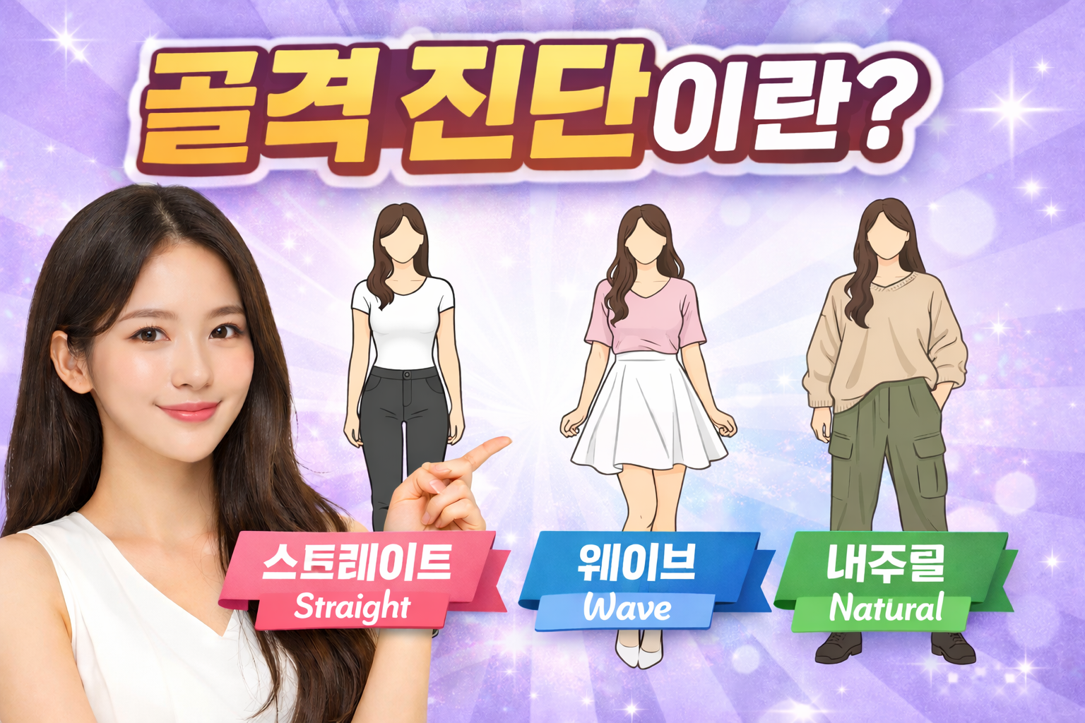 일반적으로 퍼스널 컬러처럼 사계절로 나누는 것과 비슷하게, 골격 진단은 스트레이트, 웨이브, 내추럴 세 가지 큰 카테고리로 구분됩니다. 인간의 몸은 뼈, 근육, 지방이라는 세 가지 요소로 구성되는데, 이 중 어떤 요소가 가장 두드러지게 발달했느냐에 따라 타입이 결정됩니다.