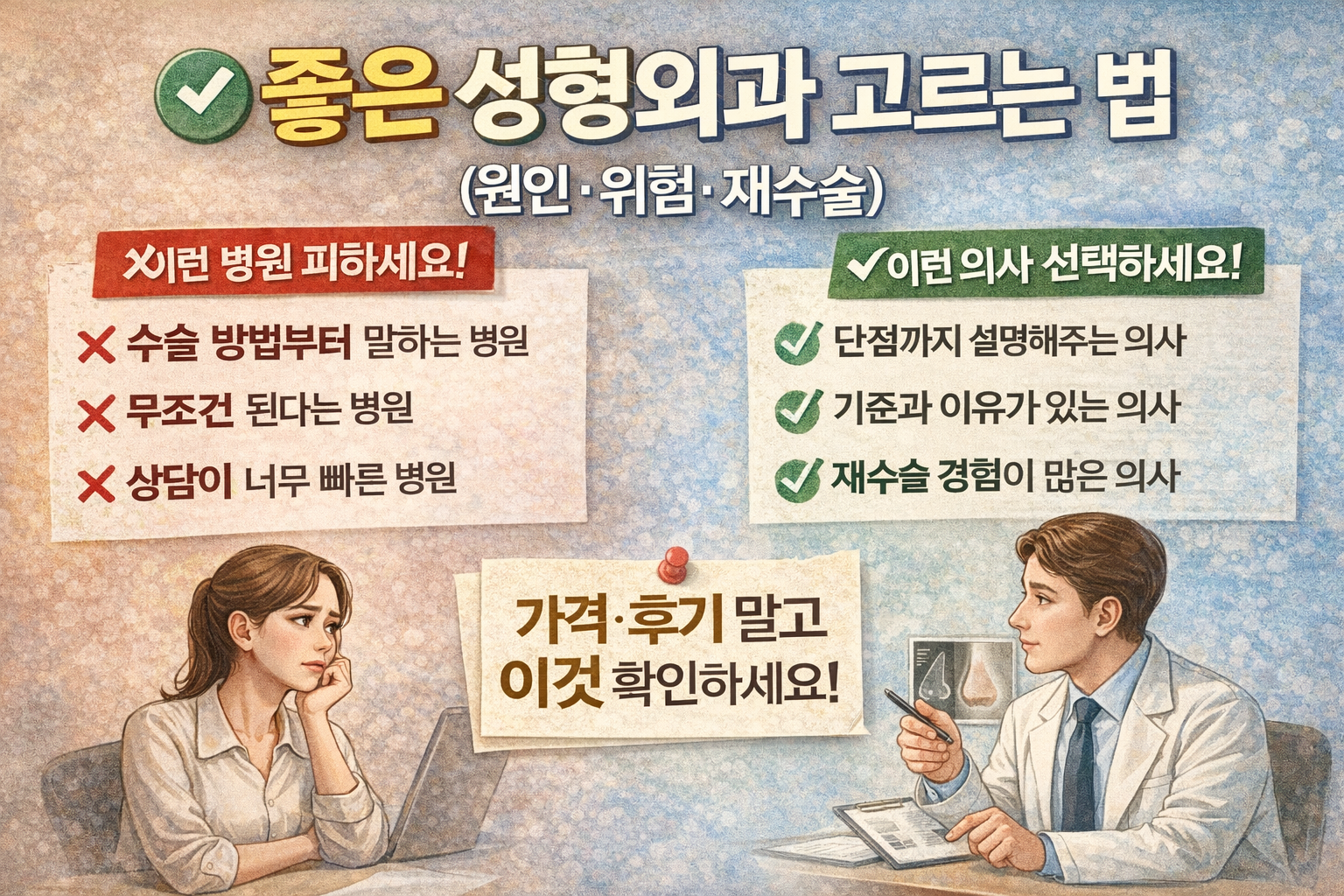 저는 이 기준을 바탕으로 병원을 선택했고, 지금까지 만족하고 있습니다. 물론 사람마다 중요하게 생각하는 기준이 다를 수 있지만, 최소한 이 세 가지만 확인해도 "망할 확률"은 확실히 줄어듭니다. 성형 수술은 인생에 한 번뿐일 수도 있고, 잘못되면 평생 고생할 수도 있는 선택입니다. 가격이나 후기만 보고 결정하기보다는, 실제로 나를 수술할 의사가 어떤 사람인지, 나와 충분히 소통할 준비가 되어 있는지 먼저 확인해보시길 바랍니다.